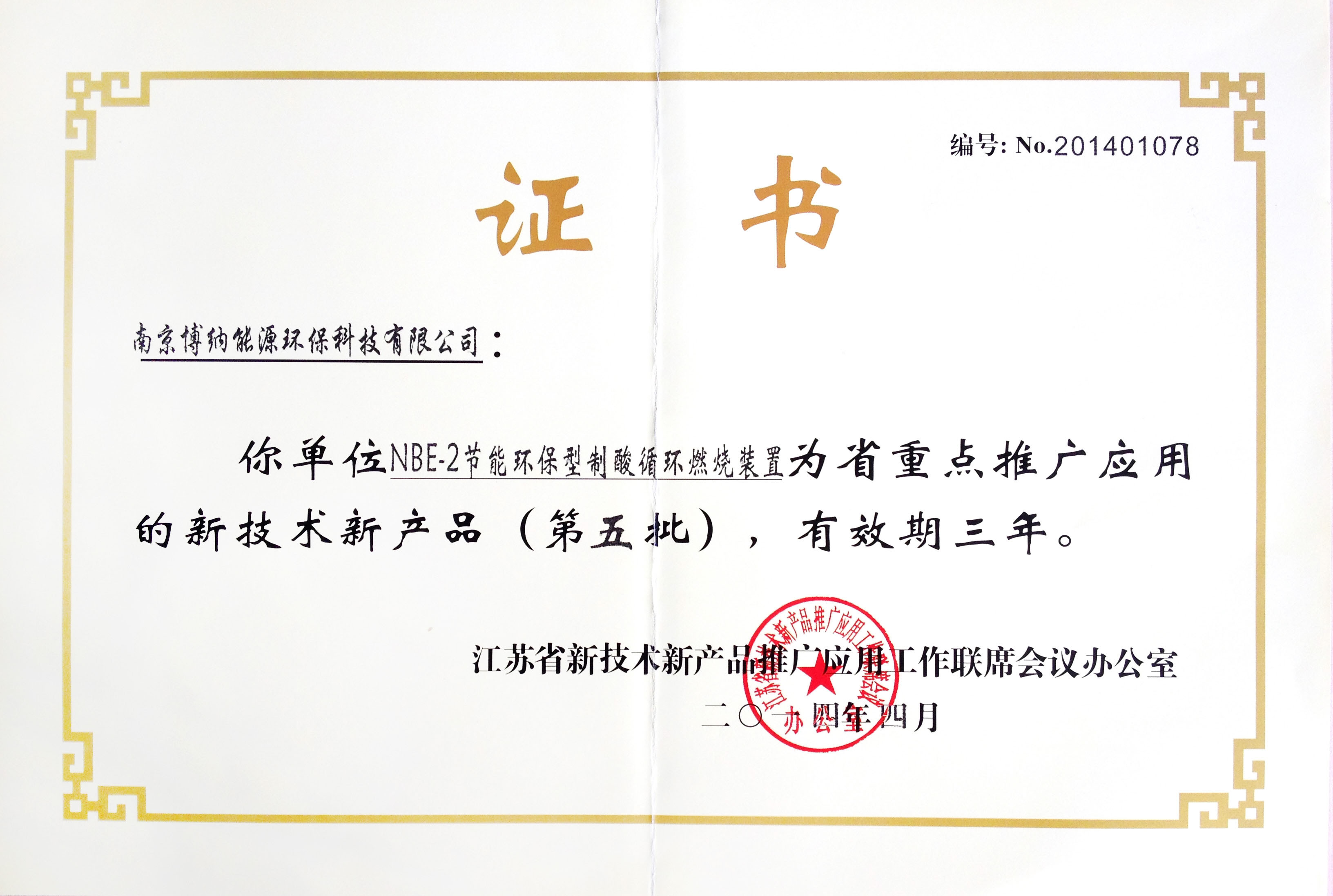 博納科技硫回收及WSA制酸工藝熱解焚燒爐燃燒器獲得江蘇省重點推廣應用的新技術新產品認證。